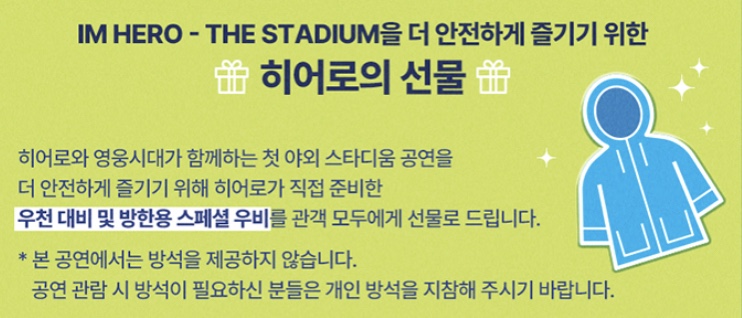 히어로와 영웅시대가 함께하는 첫 야외 스타디움 공연을 더 안전하게 즐기기 위해 히어로가 직접 준비한 우천 대비 및 방한용 스페셜 우비를 관객 모두에게 선물로 드립니다.