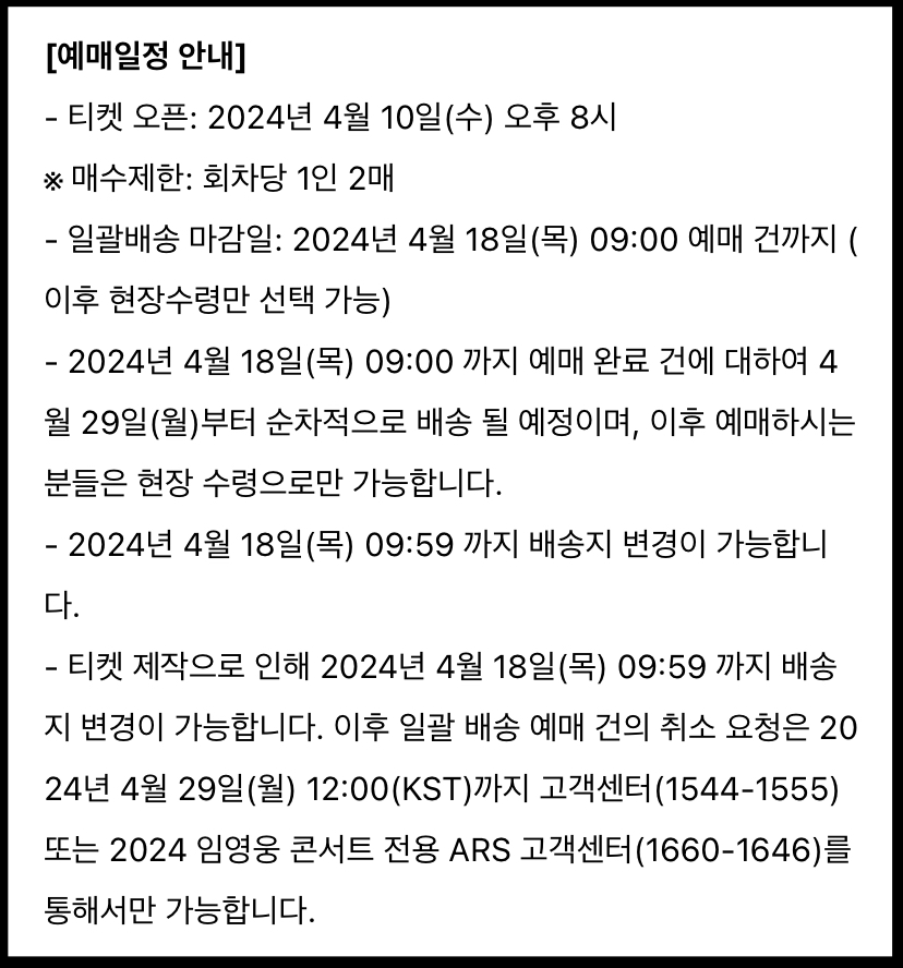 - 티켓 제작으로 인해 2024년 4월 18일(목) 09:59 까지 배송지 변경이 가능합니다. 이후 일괄 배송 예매 건의 취소 요청은 2024년 4월 29일(월) 12:00(KST)까지 고객센터(1544-1555) 또는 2024 임영웅 콘서트 전용 ARS 고객센터(1660-1646)를 통해서만 가능합니다.