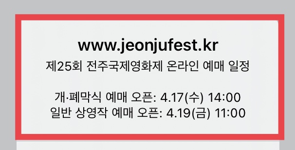 제25회 전주국제영화제가 5월 1일 개막을 합니다. 이번 전주국제영화제 개 폐막식 예매는 4월 17일 오후 2시에 오픈되는데요. 일반 예매는 4월 19일 오전 11시부터 가능하며, 예매하는 곳은 전주국제영화제 공식 홈페이지 또는 앱을 통해 가능합니다.