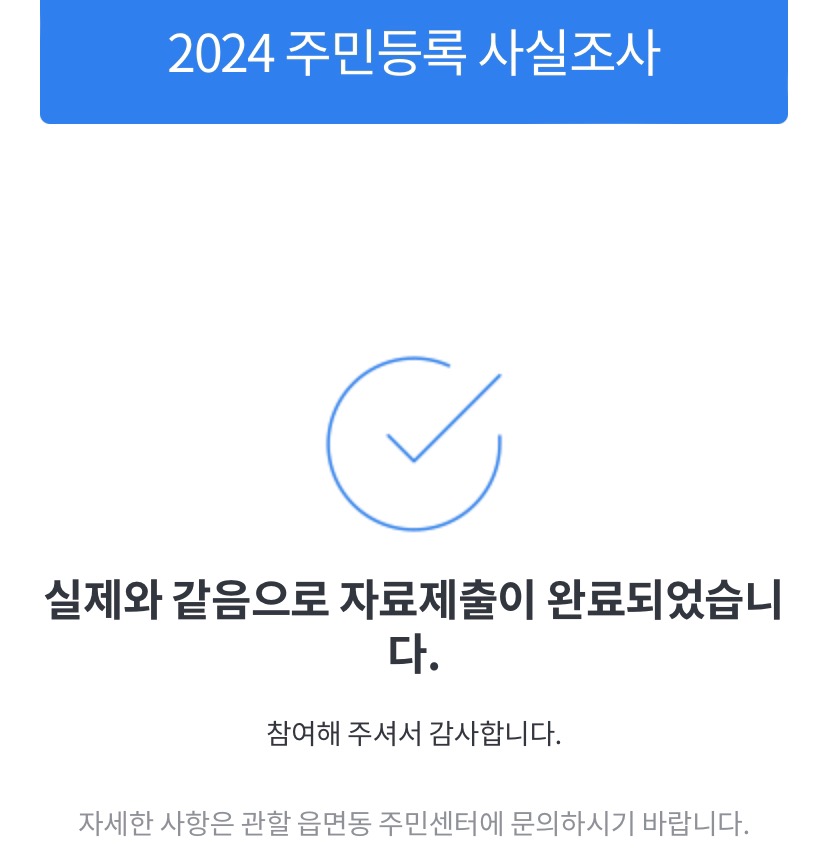 11. 실제와 같으므로 자료제출이 완료되었습니다라고 뜹니다. 이렇게 2024 주민등록 사실조사 비대면이 완료됩니다. 자세한 사항은 주민센터에 문의하실 수 있습니다.