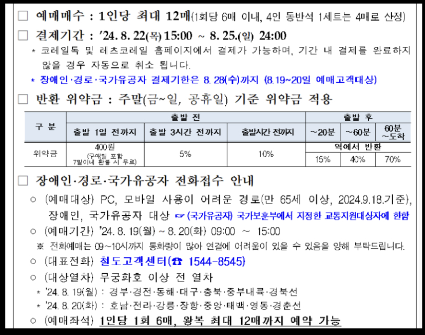 - 결제기간: 2024년 8월 22일(목) 15:00~8월 25일(일) 24:00까지(코레일톡 레츠코레일 홈페이지에서 결제가 가능하며 기간내에 결제를 완료하지 못할 경우 자동으로 취소가 됩니다) 장애인·경로·국가유공자 결제기한은 8.28(수)까지(8.19~20 예매대상고객)