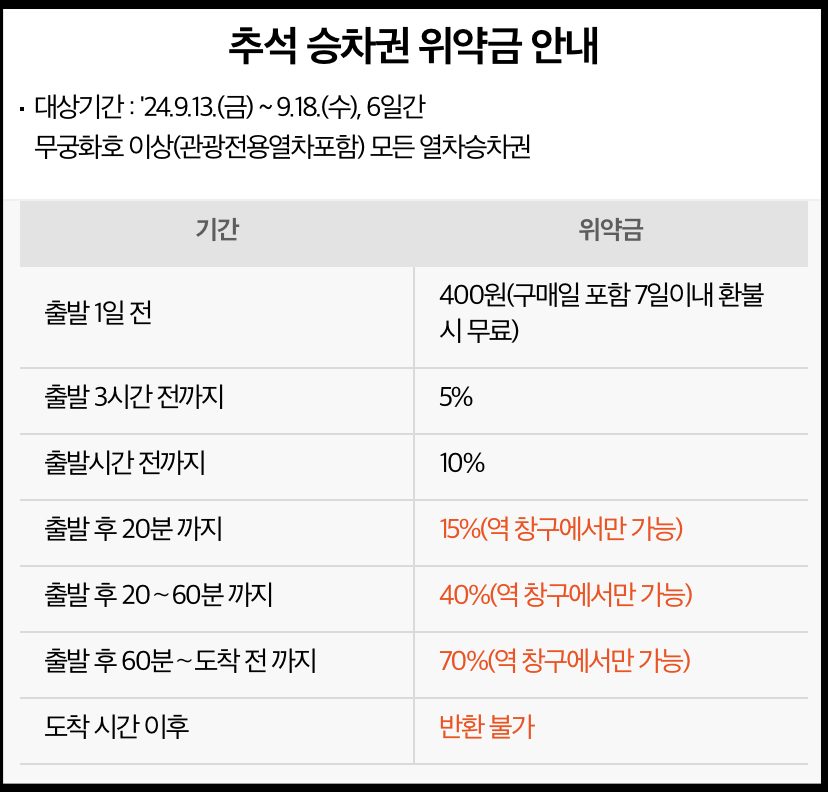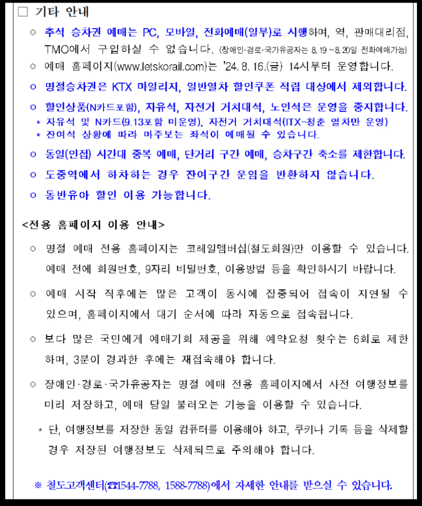 - 추석승차권 예매는 PC, 모바일, 전화예매(일부)로 시행하며 역, 판매대리점, TMO에서 구입하실 수 없습니다.(단, 장애인·경로·국가유공자는 24.8.19~20일 전화예매가능)