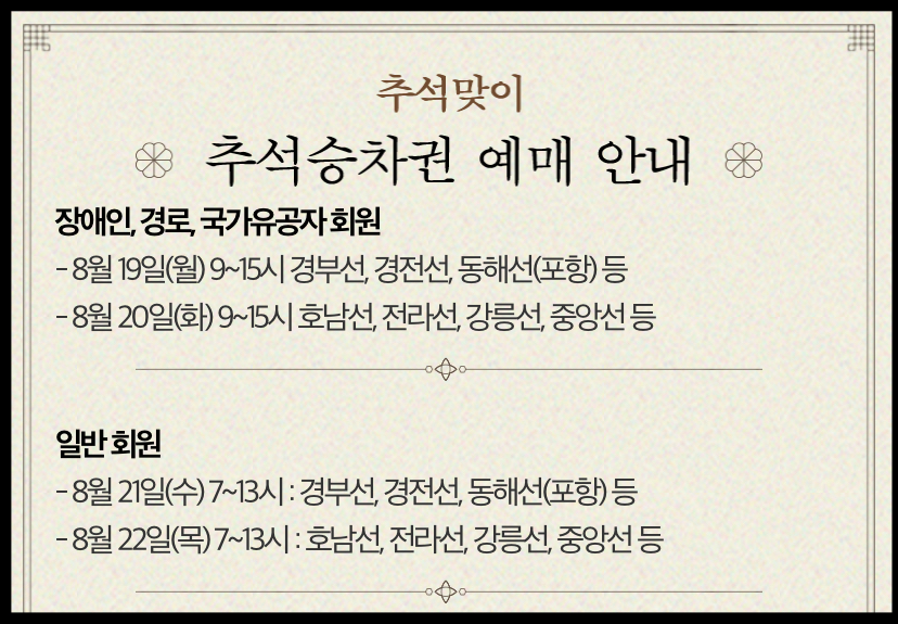 8월 21일(수)~8월 22일(목) 오전 7시부터 오후 1시까지는 경로·장애인·국가유공자(교통지원대상)를 포함한 모든 국민이 홈페이지나 코레일톡 등 온라인으로 추석 승차권을 예매할 수 있습니다.
