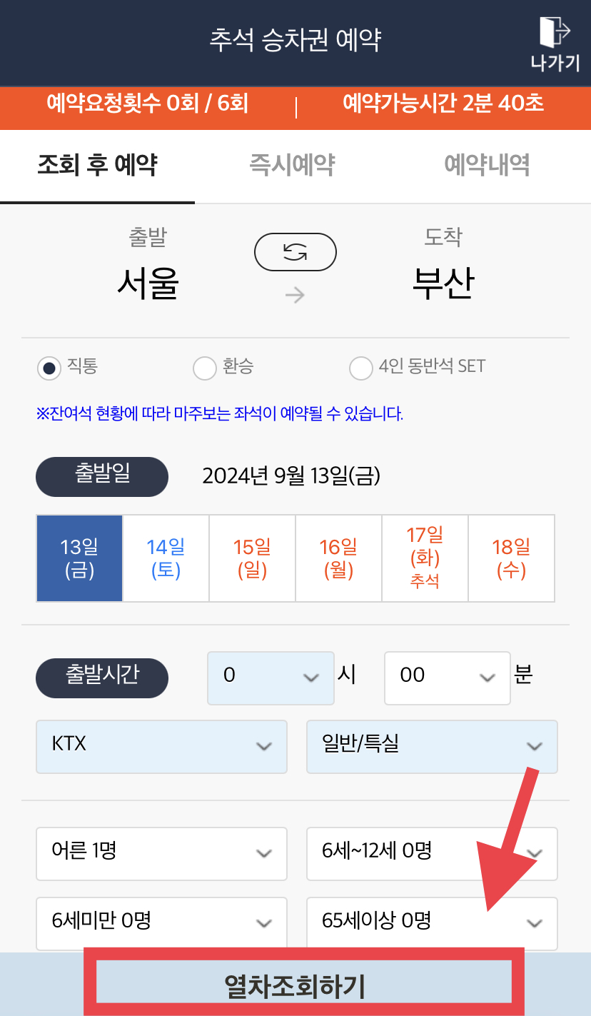 보다 많은 국민에게 예매기회 제공을 위해 예약요청 횟수는 6회로 제한하며, 3분이 경과한 후에는 재접속해야 합니다.