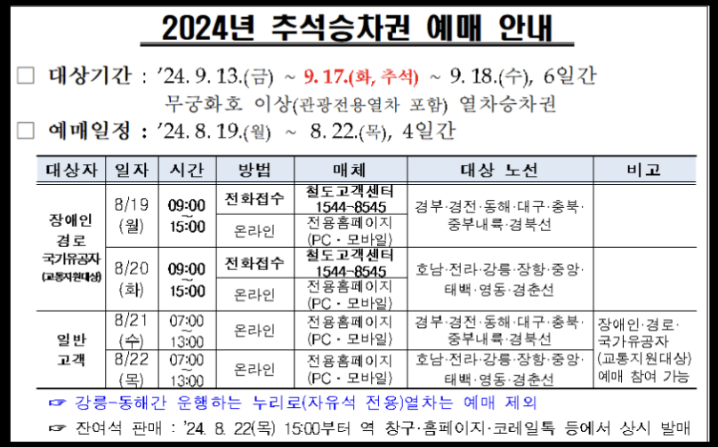 - 추석승차권 예매는 PC, 모바일, 전화예매(일부)로 시행하며 역, 판매대리점, TMO에서 구입하실 수 없습니다.(단, 장애인·경로·국가유공자는 24.8.19~20일 전화예매가능)
