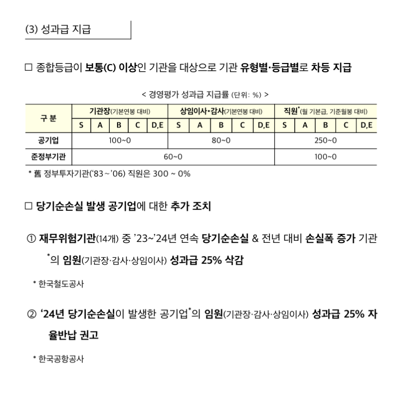 성과급이 평가 결과에 연동되면서 직원들도 민감합니다. S등급을 받은 공기업은 기본급의 최대 250%까지 성과급으로 받지만 D나 E등급을 받은 기관은 성과급이 없습니다.