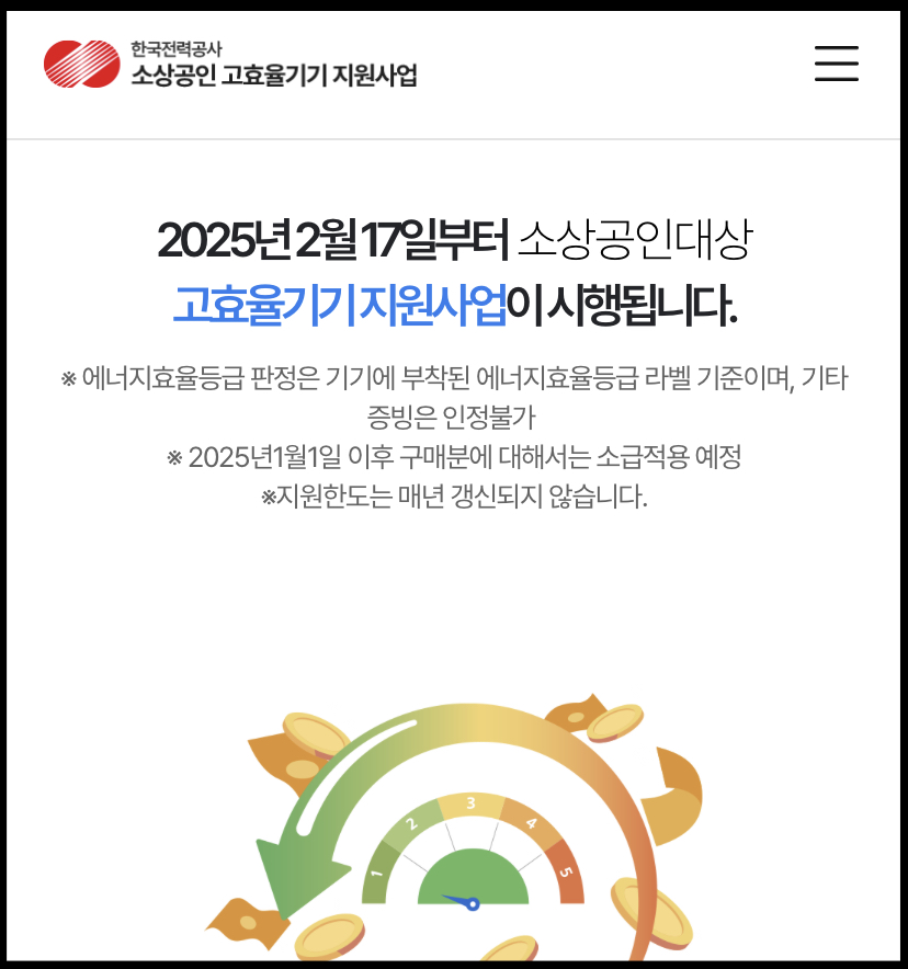 2025년 소상공인 고효율기기 지원사업이 2월 17일부터 379억원 규모로 시작됩니다. 산업통상자원부는 소상공인의 에너지비용 부담 완화가 목적인 이번 지원사업을 한국전력공사 사업 홈페이지를 통해서 소상공인 고효율기기 지원사업 보조금 신청·접수를 진행한다고 했습니다. 그럼 2025 소상공인 고효율기기 지원사업 신청 홈페이지 바로가기에 대해 자세히 알아보겠습니다.