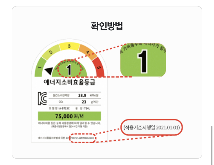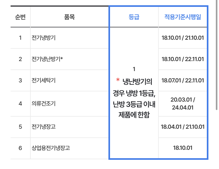아래 6개 품목 에너지소비효율”등급”과 “적용기준시행일“2가지 모두 충족하는 제품입니다.