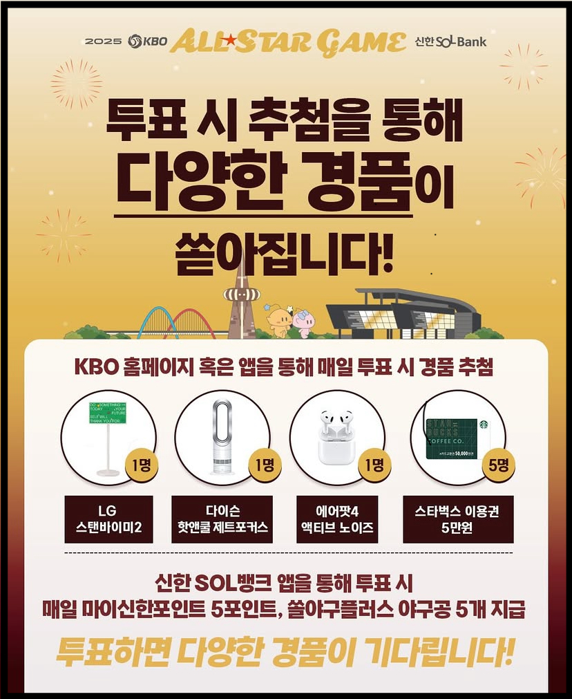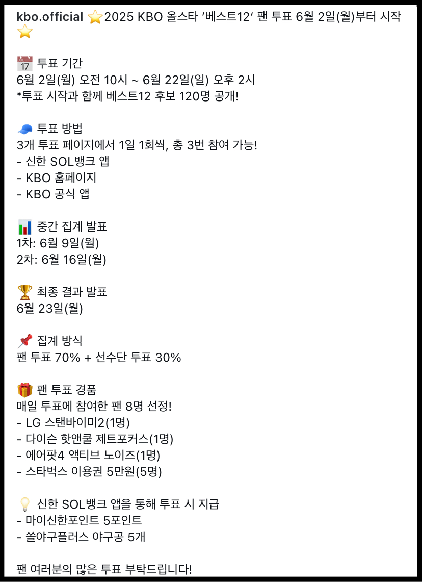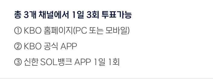 - 투표방법: 3개 투표 페이지에서 1일 1회씩 총 3번 참여 가능. 신한 SOL뱅크 앱, KBO 홈페이지, KBO 공식 앱