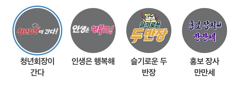 - 청년회장이 간다: (월) 고향마을의 일손을 돕고 어르신들의 외로운 마음을 달래 드리기 위해 전국 어디든 달려가며 어르신들의 귀염둥이 사랑둥이 재롱둥이 슈퍼스타 청년회장을 불러만 주세요.