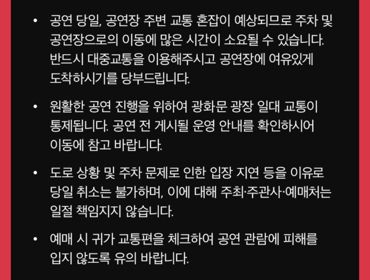 • 공연 당일, 공연장 주변 교통 혼잡이 예상되므로 주차 및 공연장으로의 이동에 많은 시간이 소요될 수 있습니다.