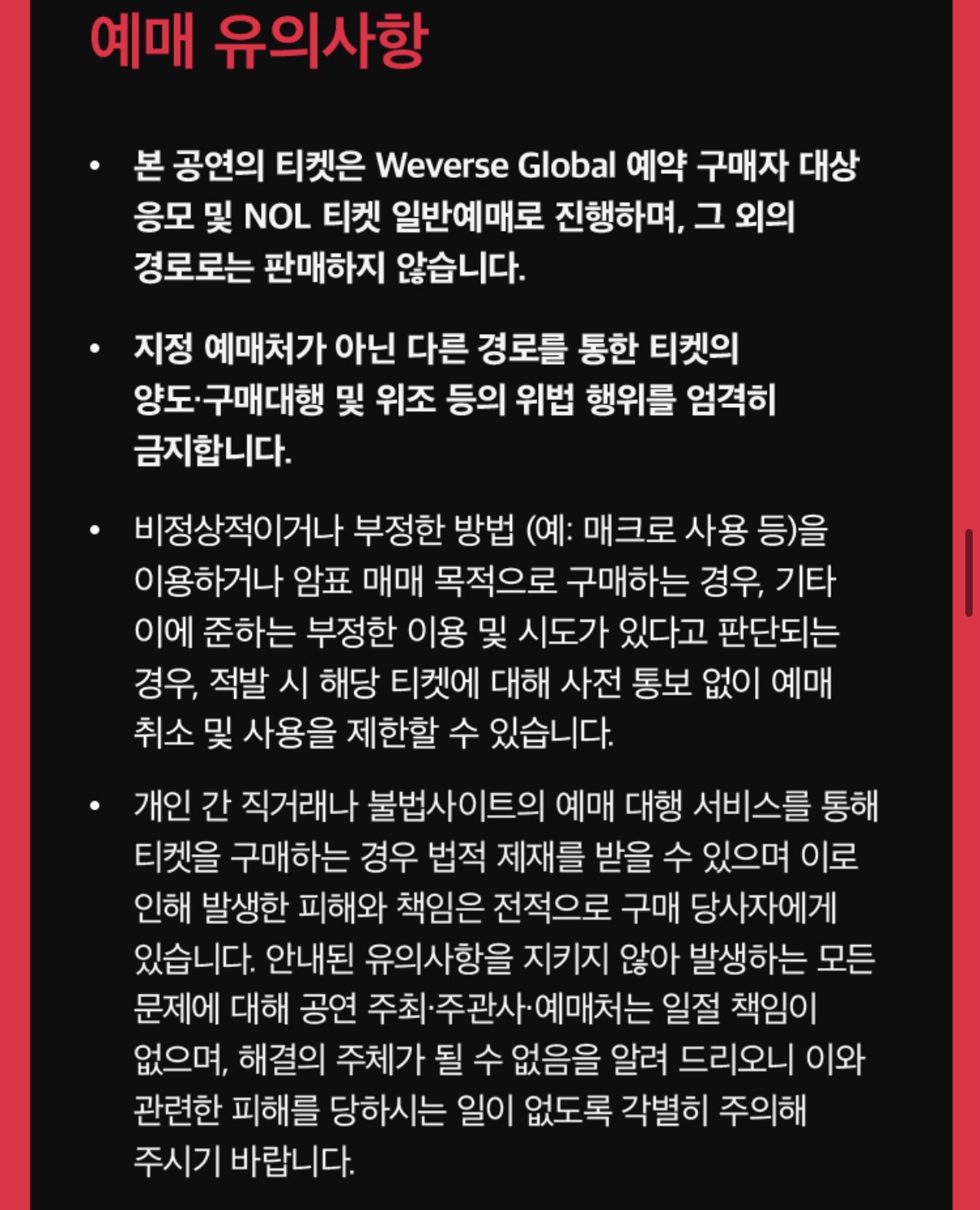 • 비정상적이거나 부정한 방법 (예: 매크로 사용 등)을 이용하거나 암표 매매 목적으로 구매하는 경우, 기타 이에 준하는 부정한 이용 및 시도가 있다고 판단되는 경우, 적발 시 해당 티켓에 대해 사전 통보 없이 예매 취소 및 사용을 제한할 수 있습니다.