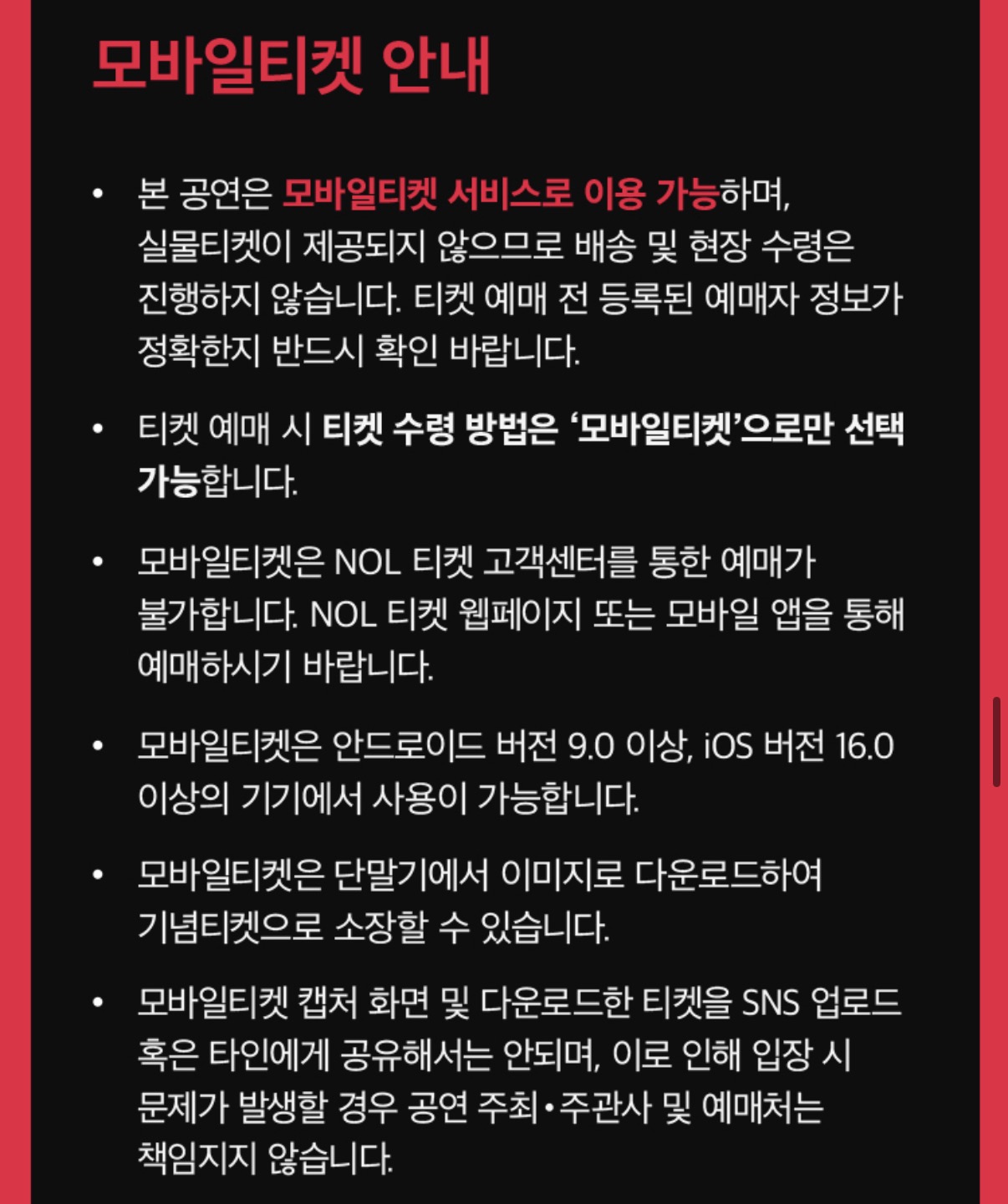• 모바일티켓 캡처 화면 및 다운로드한 티켓을 SNS 업로드 혹은 타인에게 공유해서는 안되며, 이로 인해 입장 시 문제가 발생할 경우 공연 주최• 주관사 및 예매처는 책임지지 않습니다.