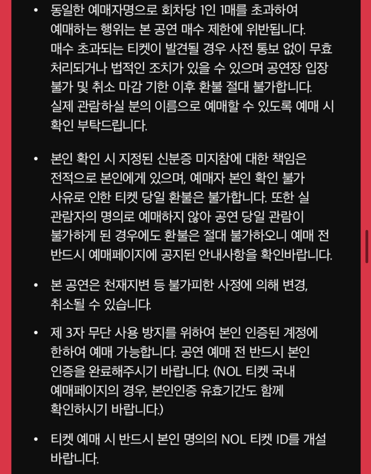 • 본인확인 부스 혼잡으로 인한 입장 지연 등을 이유로하는 당일 환불은 불가합니다. 입장에 지연이 없도록 공연장에 미리 도착하여 본인 확인을 완료해주시기 바랍니다.