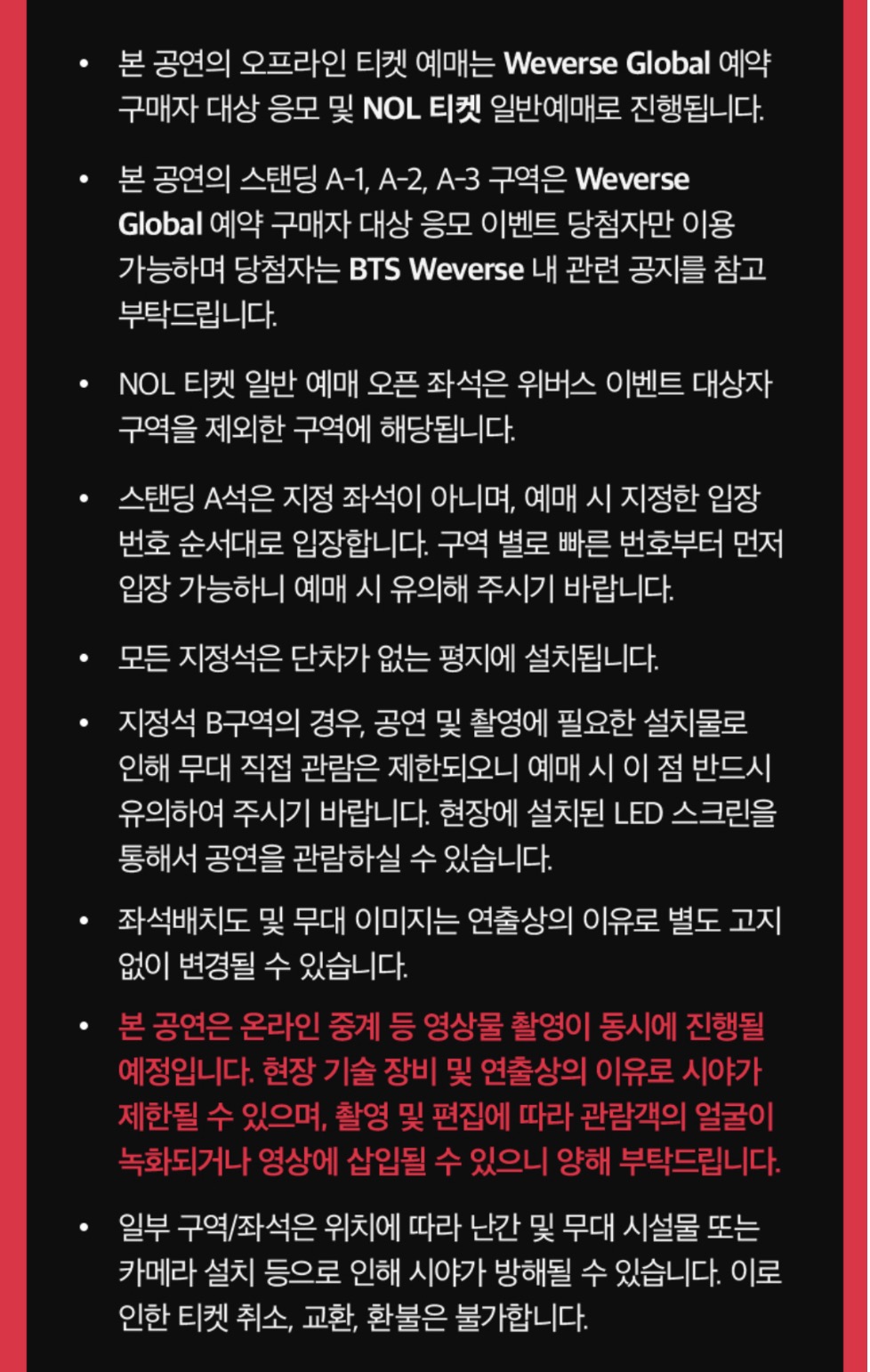 • 본 공연의 스탠딩 A-1, A-2, A-3 구역은 Weverse Global 예약 구매자 대상 응모 이벤트 당첨자만 이용 가능하며 당첨자는 BTS Weverse 내 관련 공지를 참고 부탁드립니다.