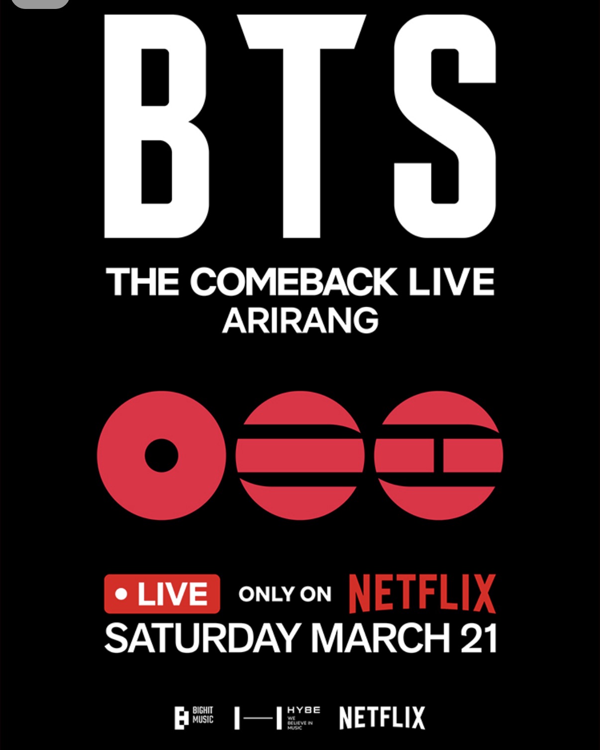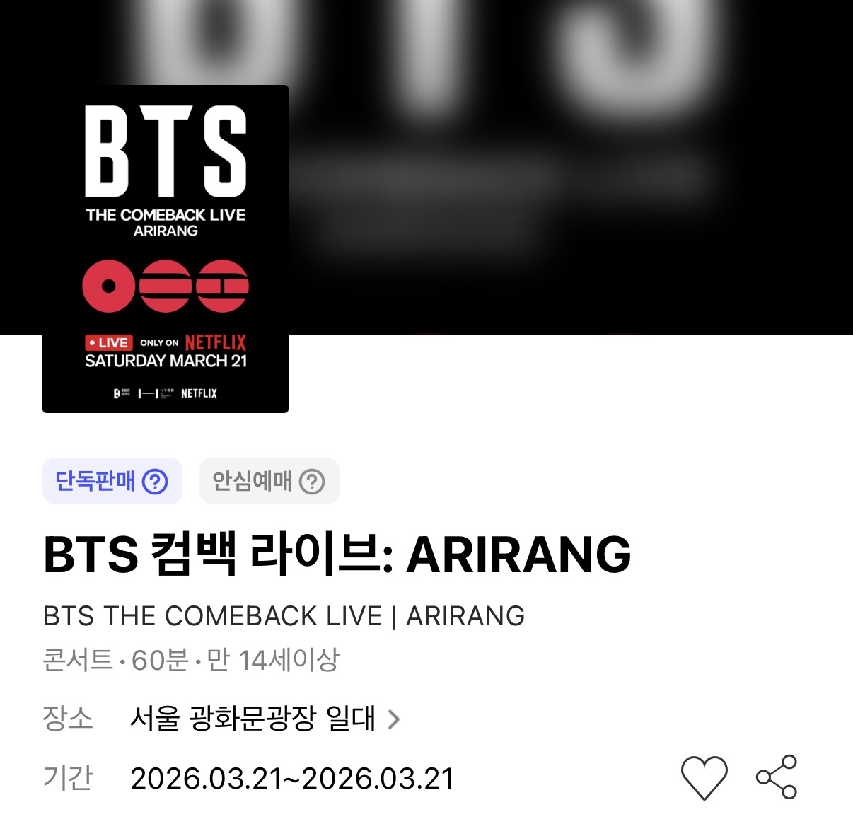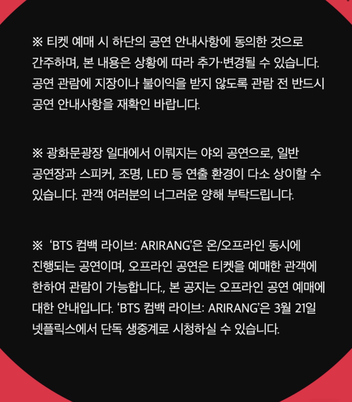 ※ 'BTS 컴백 라이브: ARIRANG'은 온/오프라인 동시에 진행되는 공연이며, 오프라인 공연은 티켓을 예매한 관객에 한하여 관람이 가능합니다., 본 공지는 오프라인 공연 예매에 대한 안내입니다. BTS 컴백 라이브: ARIRANG은 3월 21일 넷플릭스에서 단독 생중계로 시청하실 수 있습니다.