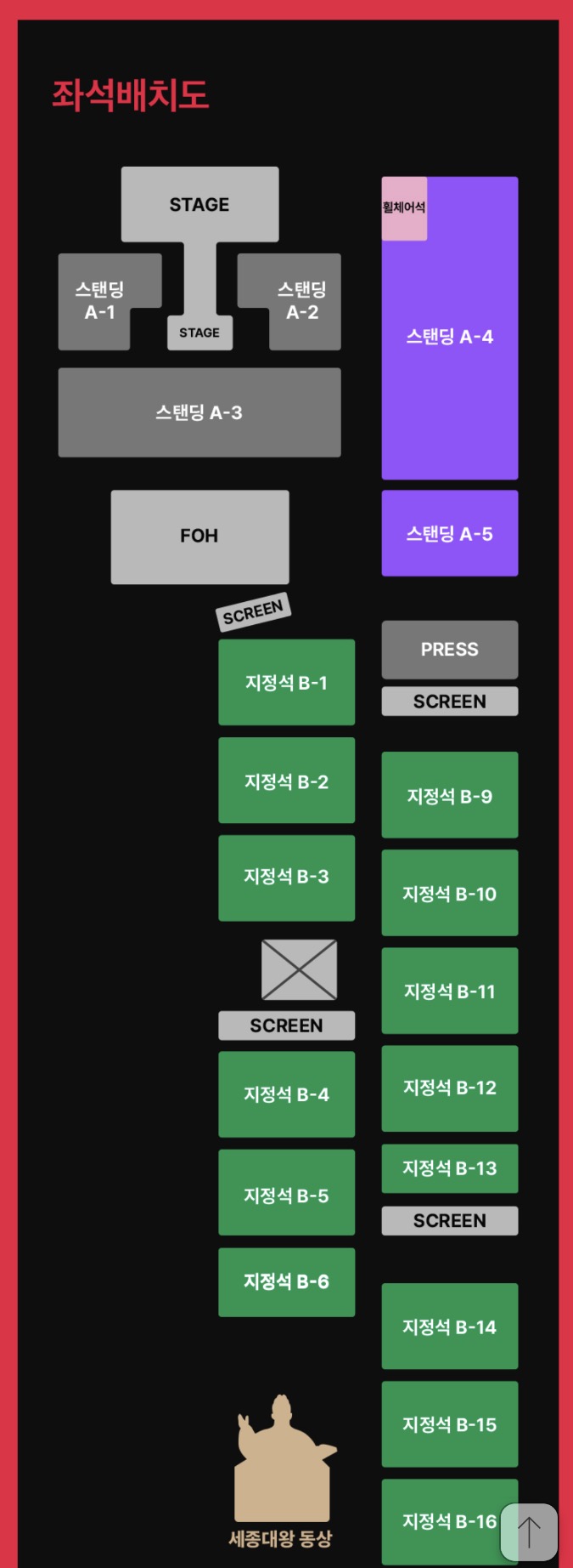 • 스탠딩 A석은 지정 좌석이 아니며, 예매 시 지정한 입장 번호 순서대로 입장합니다. 구역 별로 빠른 번호부터 먼저 입장 가능하니 예매 시 유의해 주시기 바랍니다.