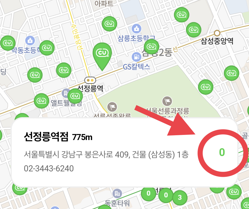 3. 현 지도에서 검색으로 현재 본인이 위치한 곳과 가까운 CU편의점을 확인하여 원하시는 편의점을 눌러줍니다.