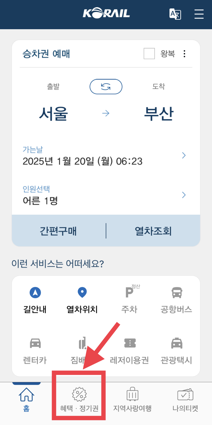 1. 코레일톡 앱을 열고 하단에 있는 혜택 • 정기권을 눌러줍니다.