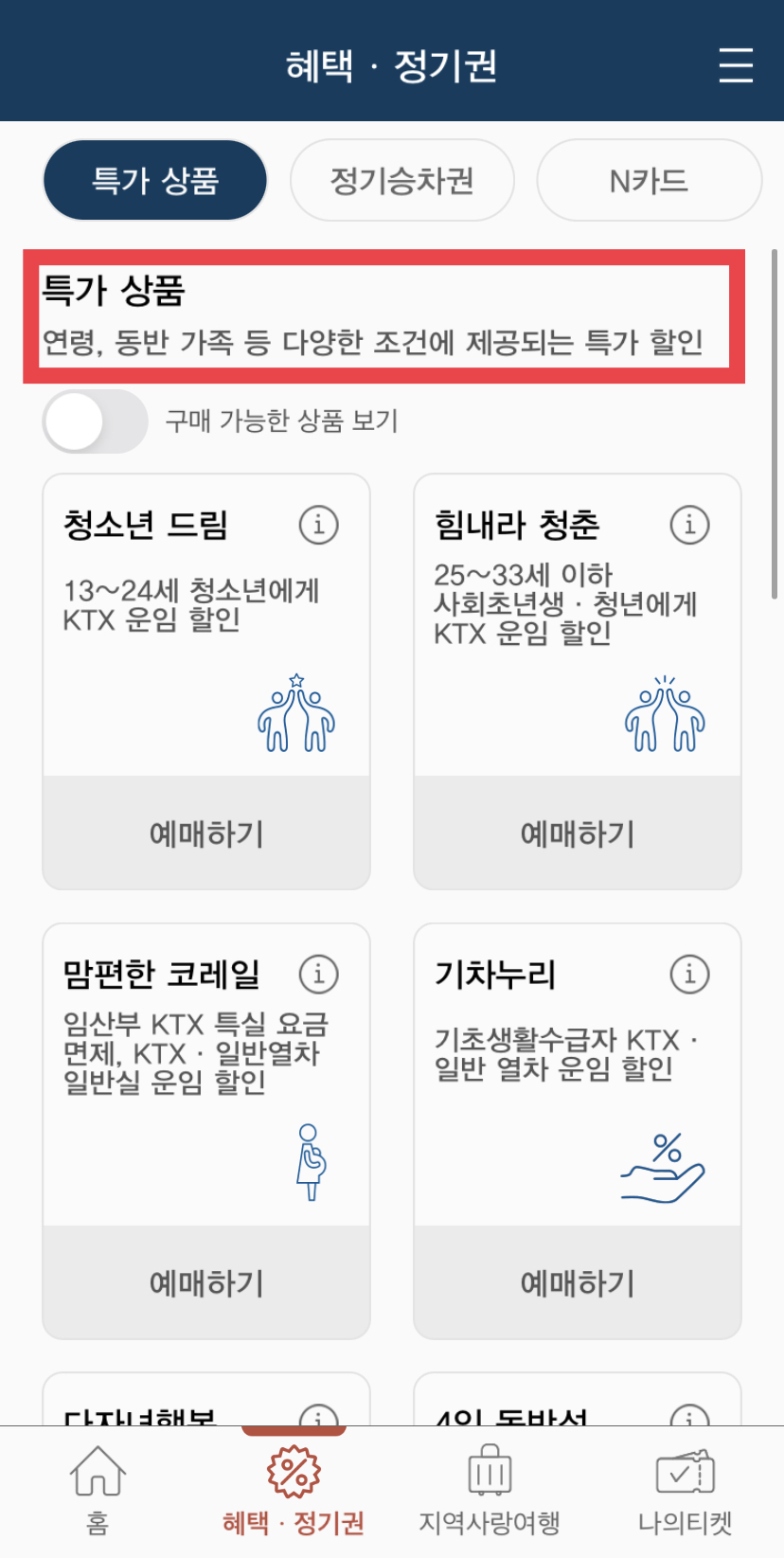 2. 혜택 • 정기권 탭에서 특가상품 목록에 설 KTX 특가를 선택합니다.