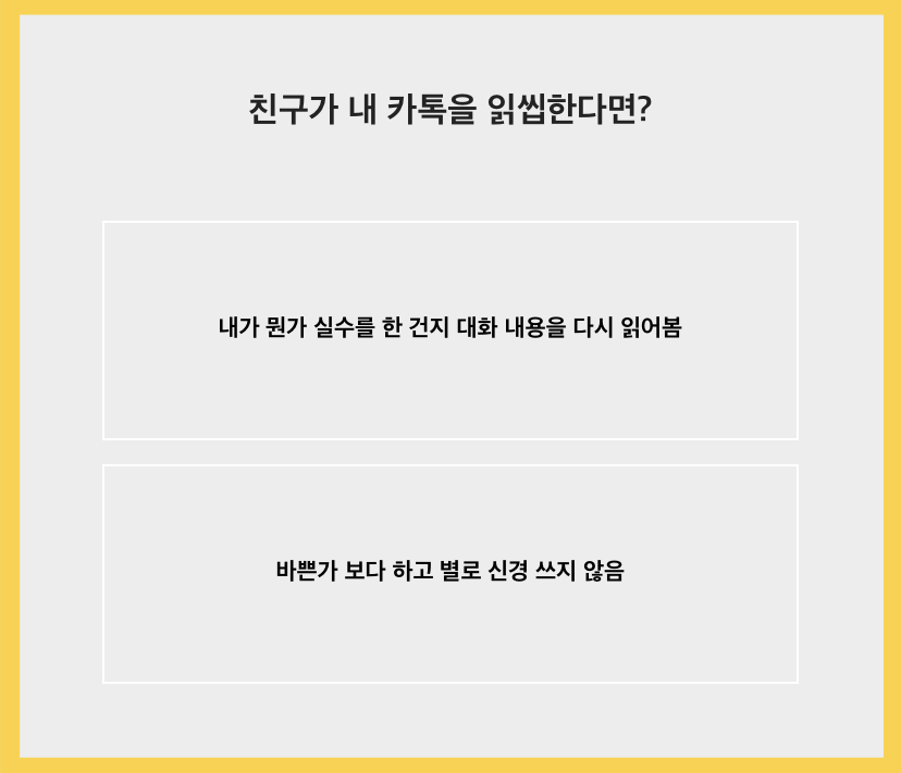 친구가 내 카톡을 읽씹하면 기분은 신경쓰이지만 그것까지 신경쓰고 있을 겨를이 없어 그냥 바쁜가하고 카톡을 안보고 있을 것 같습니다. 신경 쓸 시간에 제 할일을 마저 합니다.