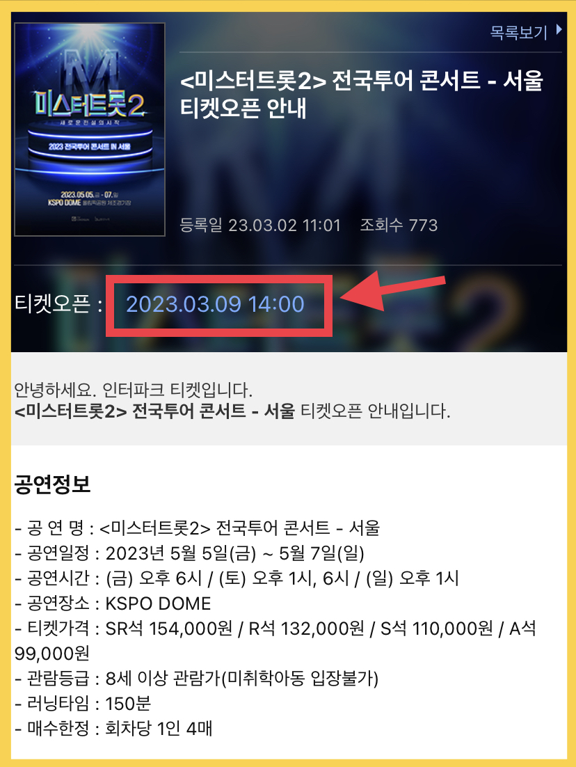 미스터트롯2 콘서트 전국투어의 포문을 열게 될 서울 공연 일정은 오는 5월 5일부터 5월 7일까지 총 3일간 서울 올림픽 체조경기장 KSPO DOME에서 펼쳐집니다. 서울 공연 티켓 예매는 3월 9일 오후 2시부터 인터넷 예매 사이트인 인터파크 티켓을 통해서 오픈되는데요. 워낙 인기가 많은 콘서트로 예상되다보니 날짜와 시간 잘 체크하셔서 미리 준비하신 후 꼭 예매하실 수 있기를 바랍니다.