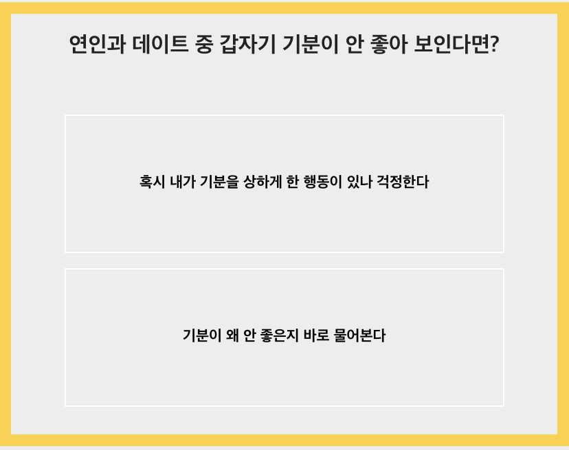 연인과 데이트 중 갑자기 기분이 안 좋아 보이면 혹시 무슨 일 때문인지 내가 실수한 점은 없었는지 물어볼 것 같습니다.