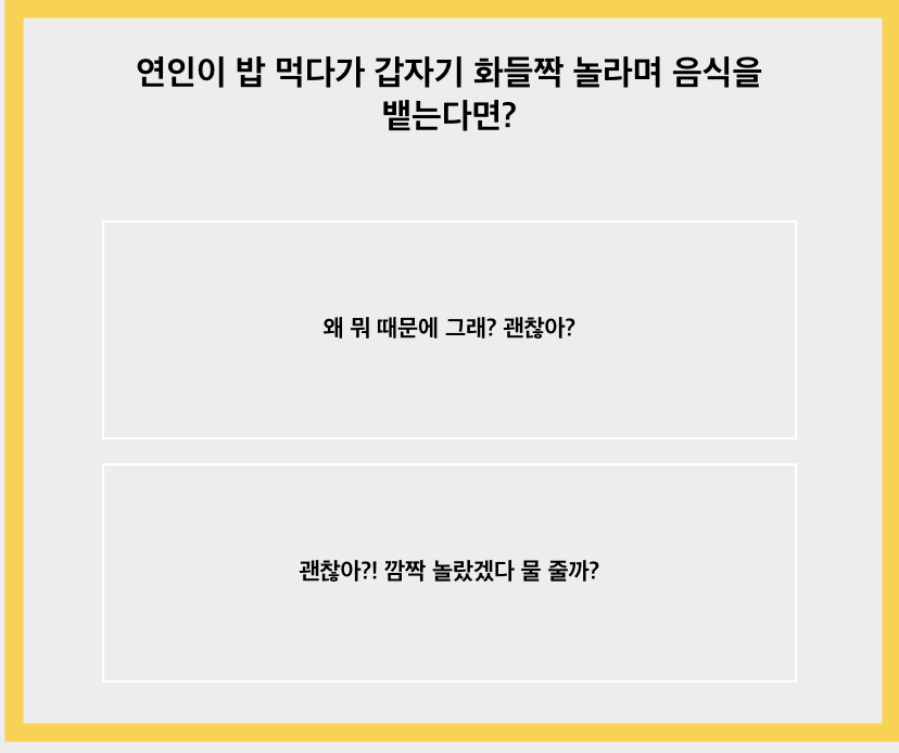 첫 번째 질문은 연인이 갑자기 친구를 부른다고 한다면이란 질문입니다. 저는 남자친구의 친구들과도 어울리는 것을 좋아하는 편이라서 부르라고 하면서 같이 놀자고 할 것 같습니다. 그런 경우도 종종 있었구요. SNS 맞팔 친구를 맺기도 할 정도로 두텁게 치내는 편입니다.