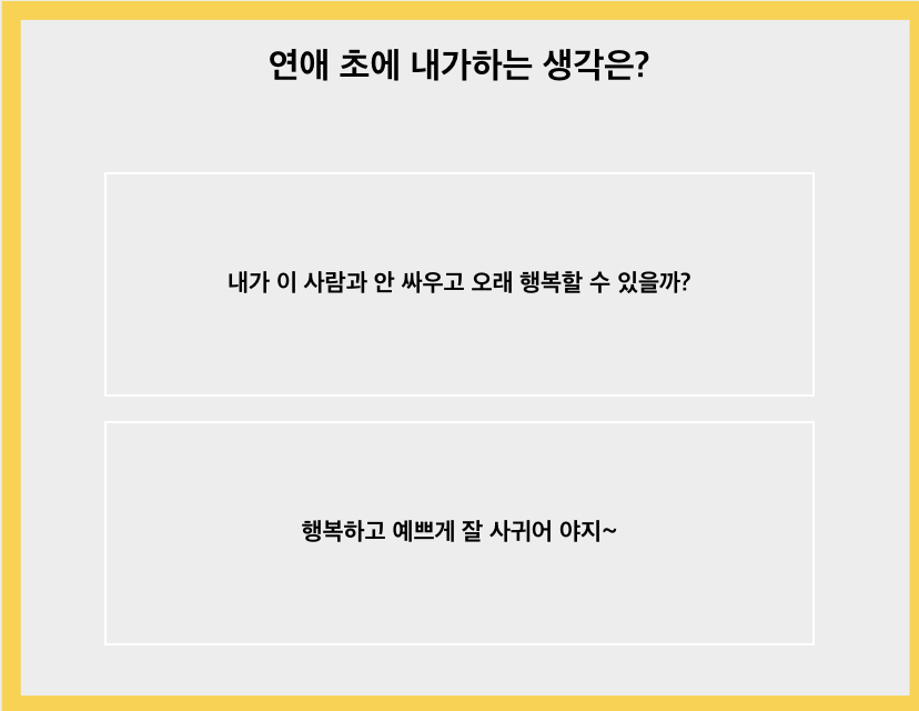 연애 초에 내가하는 생각은 행족하고 예쁘게 잘 사귄다는 긍정적인 부분만 생각해 볼 것 같습니다. 먼저 걱정하는 타입이기도 하고 연애에 있어서는 신중하기 때문에 어려운 결정을 한 뒤로는 그에 따르는 책임을 지려고 노력하는 편입니다.