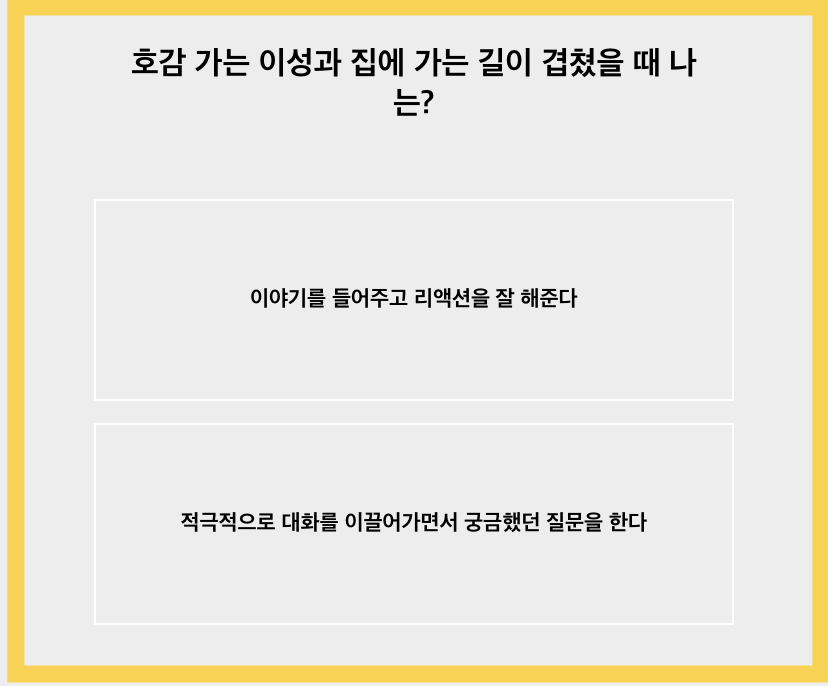 호감 가능 이성과 집에 가는 길이 겹쳤을 때는 호감은 가지만 적극적으로 리드하는 건 조금 주춤하는 편인 것 같습니다. 그래서 이야기를 잘 들어주는 편인데 리액션도 골고루 섞어주면서 즐거운 시간이 될 수 있도록 할 것 같습니다.