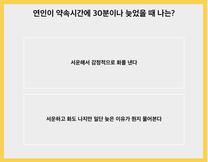 연인이 약속시간에 30분이나 늦었다면 화가 나지만 일단 늦은 이유부터 파악할 것 같습니다. 감정적으로 화를 내는 것이 해결 방법은 아니라는 판단이 먼저 들것 같습니다.