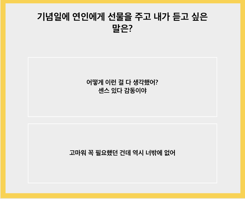 기념일에 연인에게 선물을 주고 내가 듣고 싶은 말이 있다면… 센스있다 감동이야 이런 말을 듣고 싶을 것 같습니다. 평소에 전혀 생각치도 못한 일이 벌어지면 더 감동이지 않을까 싶은 생각이 듭니다. 값비싼 선물도 중요하지만 소중한 마음을 표현해서 상대방이 감동받았으면 좋겠습니다.